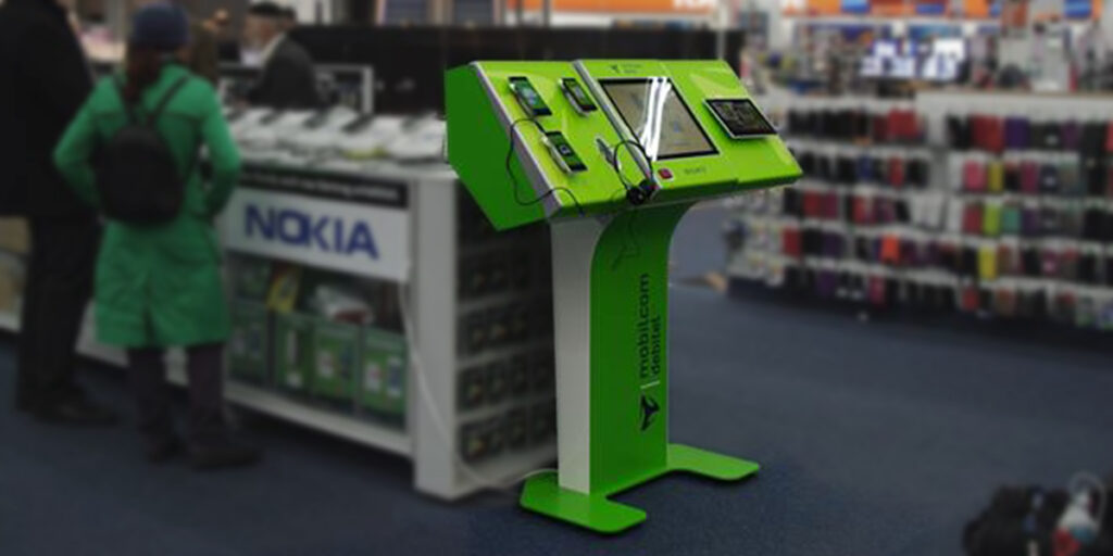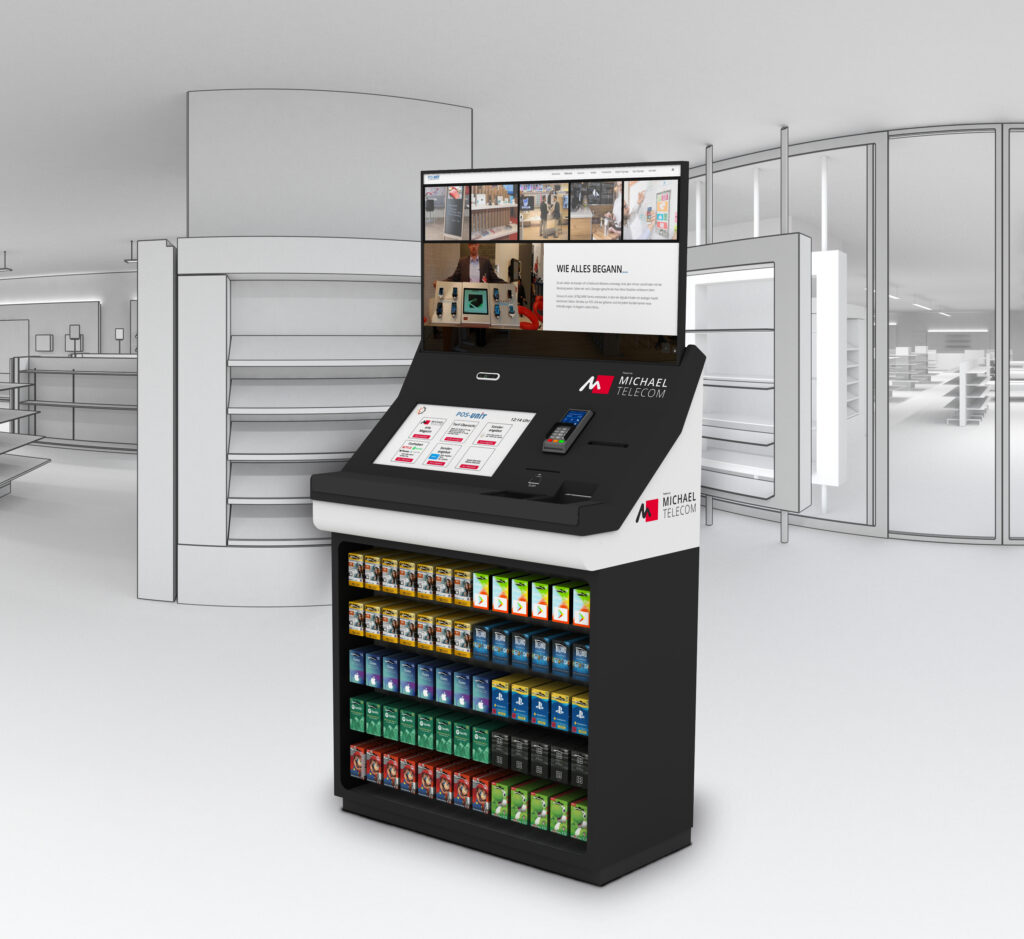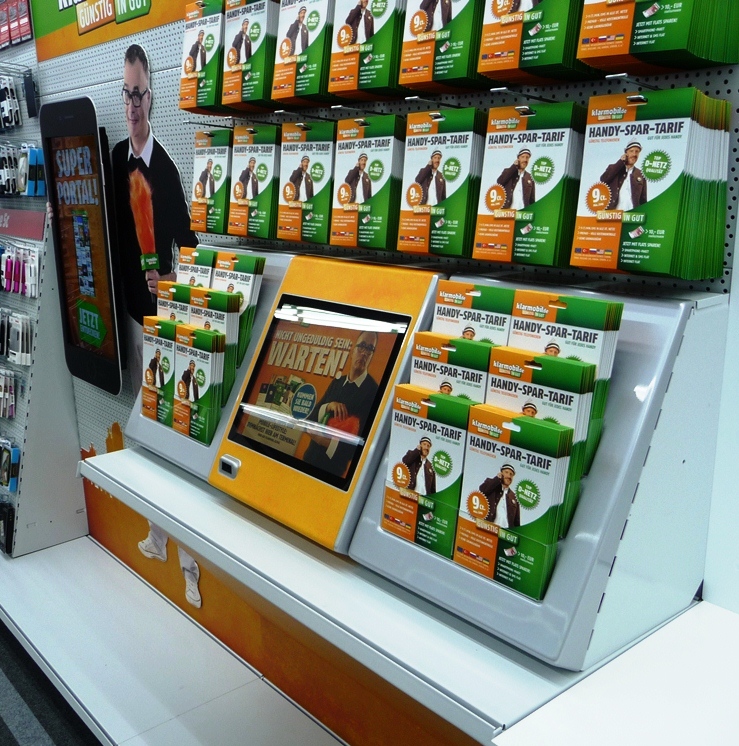 Unter dem Blister haken befindet sich ein weiterer Touch-Monitor mit Infrarot-Scanner. Handy-Pre-Paid-Karten müssen beim Kauf aktiviert werden, was an diesem Terminal schon im Shop geschieht. Eine Entlastung des Personals über eine logische Oberfläche.