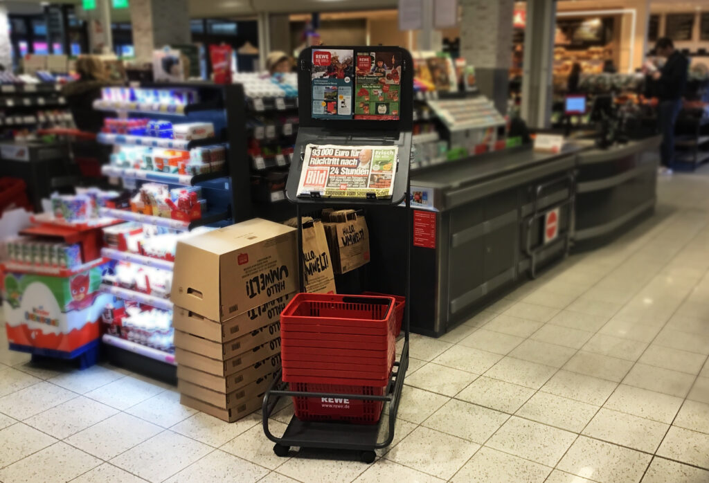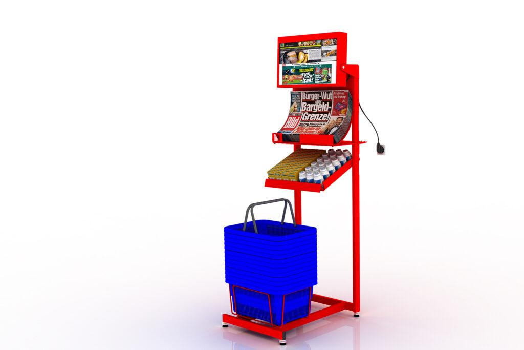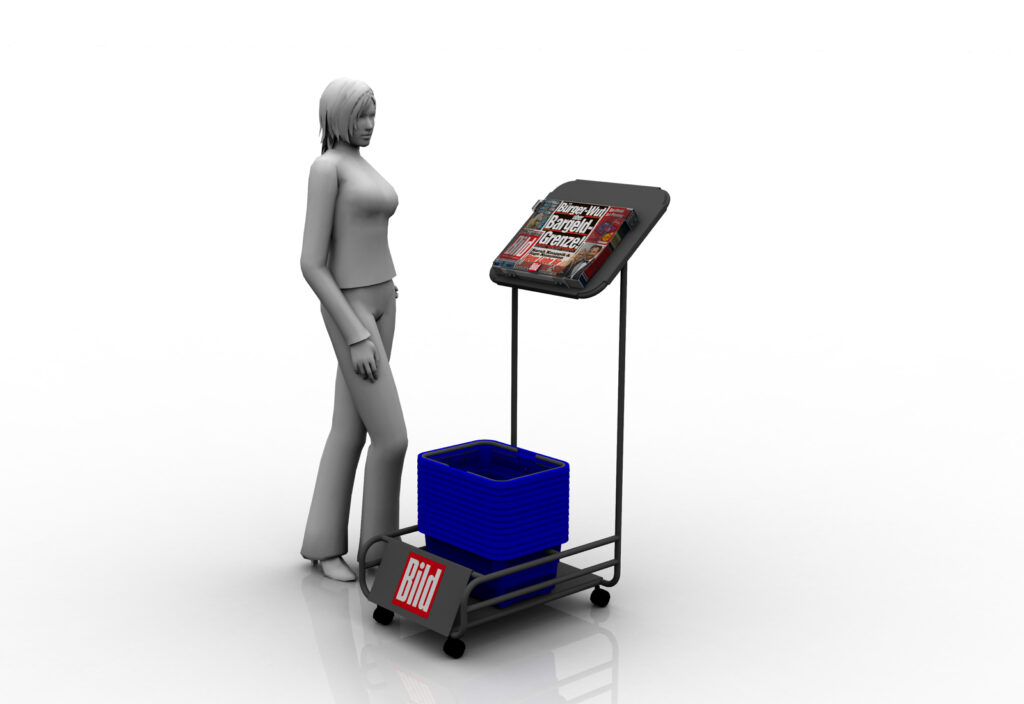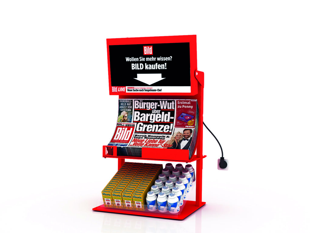 Die Zeiten in denen Deutschlands auflagenstärkste Zeitung selbstverständlich an der Supermarktkasse gekauft wurde, sind vorbei. Aufgabe war, die BILD prominent in verschiedensten Shop-Situationen prominent zu platzieren. Da Platz im Einzelhandel immer wertvoller Mangel ist, war die Idee, die Display-Reihe mit verschiedensten, zusätzlichen Möglichkeiten wie Cross-Selling-Optionen, Korbhalter und weiterer Features auszustatten.