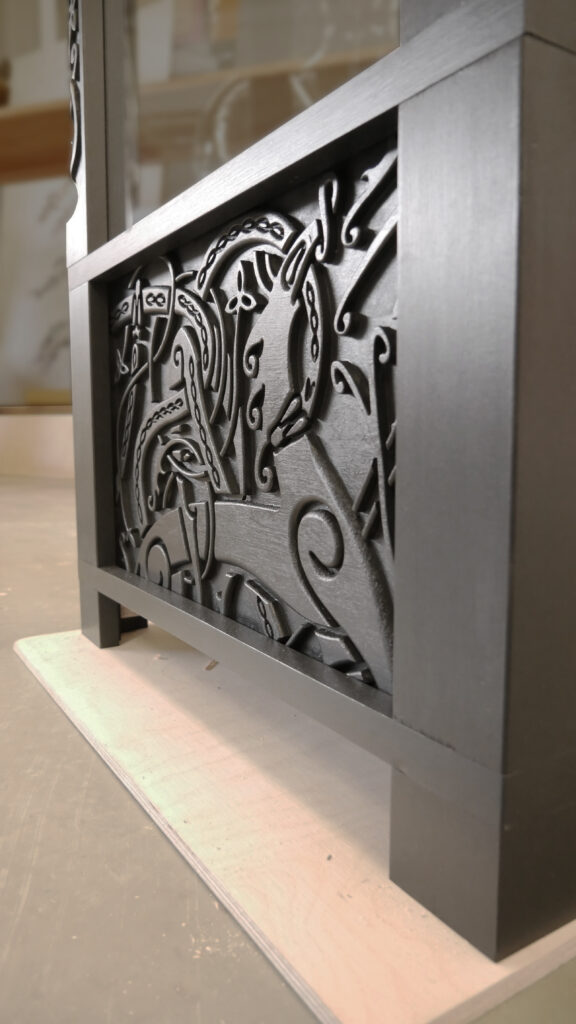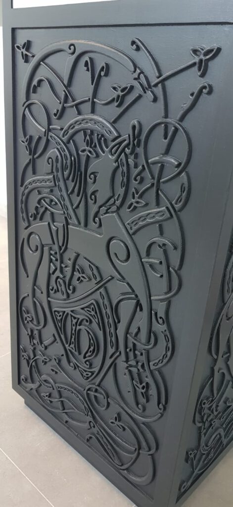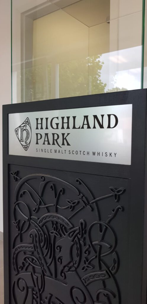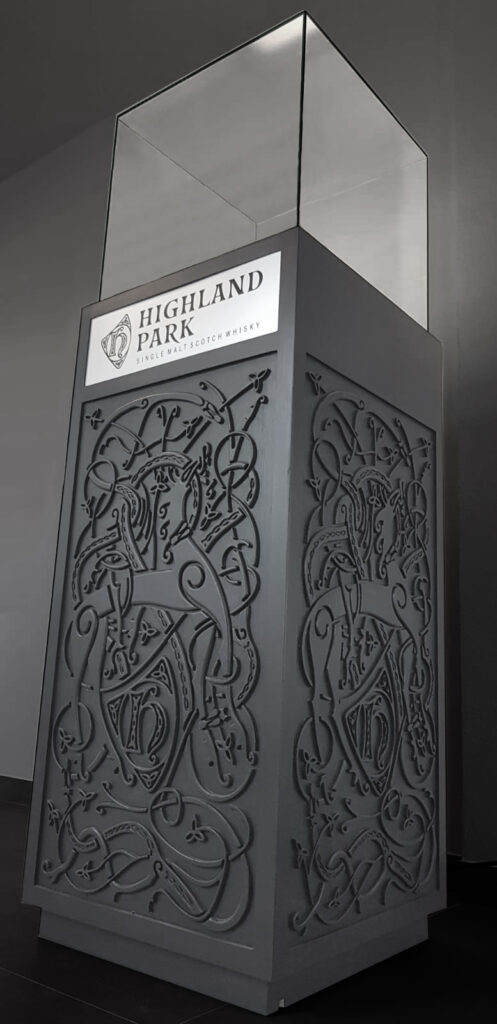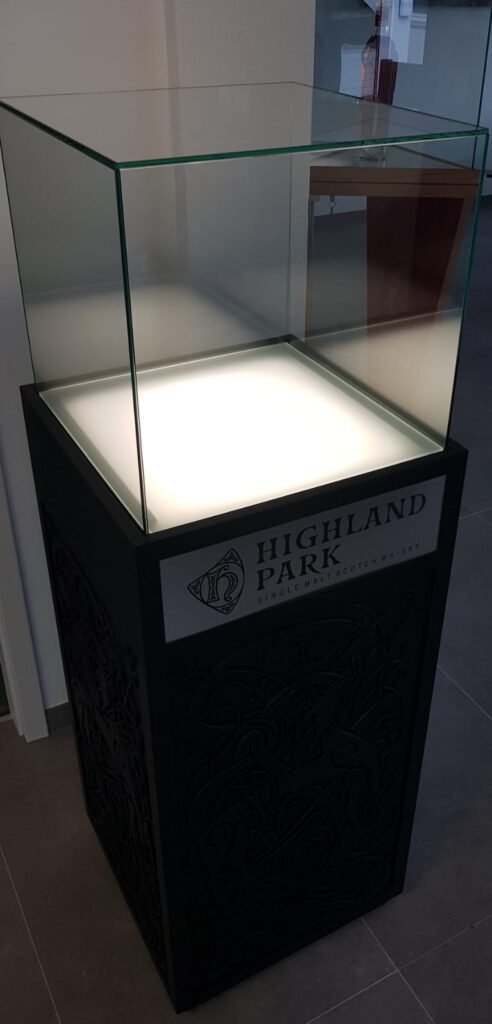 Die besondere A-Platzierung des Highland-Park Whiskeys bekommt mit diesen hochwertigen Displays höchste Wirkung! Die Pfosten der Vitrine sind von Hand, durch einen Holzbildhauer, geschnitzt worden. Die unteren Fächer sowie die 4-Seitenflächen wurden aufwendig 3D modelliert und mit einer CNC-Fräse gefräst. Die Vitrine wird von oben beleuchtet, die Stellfläche der Stele von unten. Entstanden in Kooperation mit Hagen Hamm.