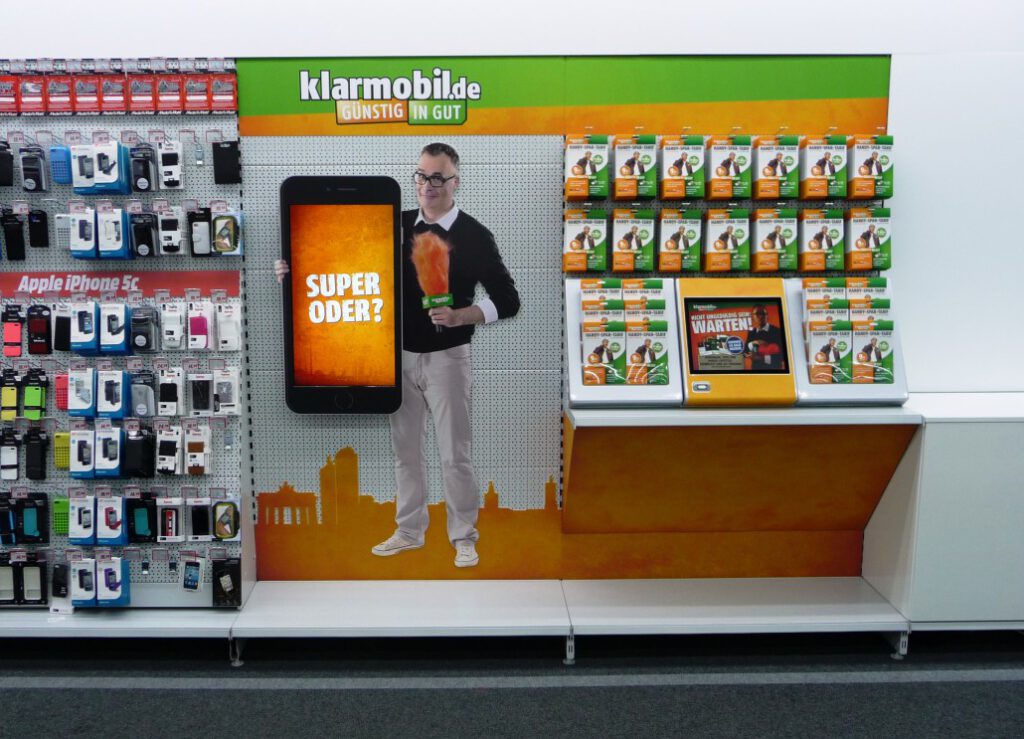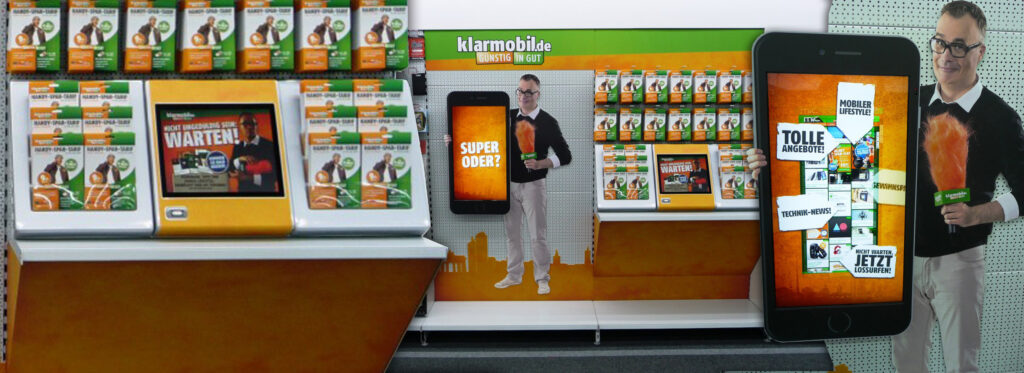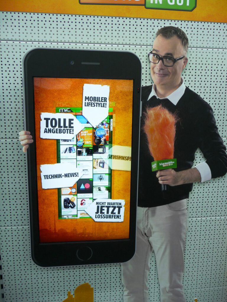 An diesem Shop-In-Shop wurde zur Fernwirkung das besondere Testimonial mit dem wuscheligem Mikrofon – bekannt aus TV-Spots – als 1,6 Meter große Figur verwendet, welche ein übergroßes Handy in der Hand hält. Das Display des Handys ist dabei ein Monitor, auf dem Webespots gezeigt werden.