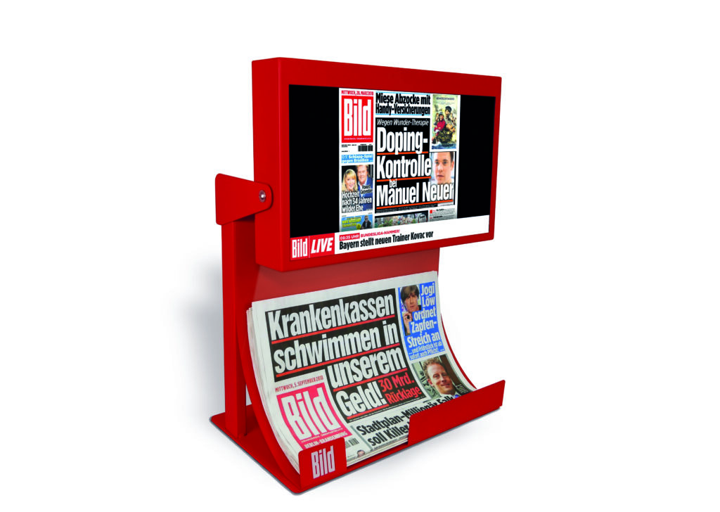 Des Weiteren kann der Retailer vor Ort über das Handy eigene Angebote zwischen die Zeilen einstellen. Unter dem Monitor liegt die aktuelle Ausgabe der Bild.